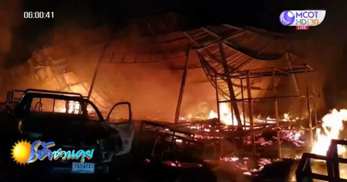 ไฟไหม้โกดังเก็บวัสดุอุปกรณ์ประกอบฉาก ซอยเฉลิมพระเกียรติ ร.9 ซอย 30 แยก 7 แขวงดอกไม้ เขตประเวศ กทม. ลามไหม้อู่ซ่อมรถ รถยนต์ถูกเผาวอดเสียหาย 6 คัน จยย.อีก 2 คัน