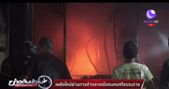 เจ้าหน้าที่พยายามฉีดน้ำสกัดเพลิงที่ลุกไหม้อย่างรุนแรง บริเวณศูนย์การค้าเซ็นเตอร์พ้อยท์ ริมถนนราชดำเนิน ย่านการค้าท่าวัง กลางเมืองนครศรีธรรมราช มีอาคารได้รับความเสียหาย 3 คูหา ค่าเสียหายเบื้องต้นนับสิบล้านบาท สาเหตุคาดเกิดจากไฟฟ้าลัดวงจร
