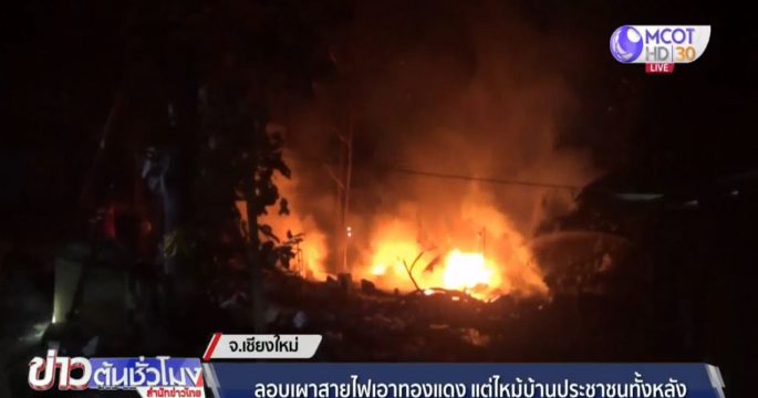ชายหาของเก่า เผาสายไฟเก่า เอาลวดทองแดง แต่ลุกลามไหม้บ้านเพื่อนบ้าน กลางเมืองเชียงใหม่ วอดเสียหายทั้งหลัง ส่วนมือเผาหลบหนีไปได้ เจ้าของบ้านเหลือแต่กางเกงในวิ่งออกมาทัน