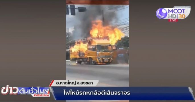 เกิดเหตุไฟไหม้รถบรรทุกหกล้อตีเส้นจราจร ขณะขับผ่านถนนสายสนามบิน ต.ควนลัง อ.หาดใหญ่ จ.สงขลา โดยไฟลุกไหม้ขึ้นจากถังสารเคมีท้ายรถ ก่อนลุกลามอย่างรวดเร็ว สาเหตุคาดหม้อแบตเตอรี่ที่ชำรุด เกิดประกายไฟติดสารเคมีบนรถ