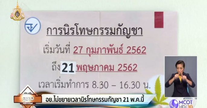 อย.ไม่ขยายเวลานิรโทษกรรมกัญชา 21 พ.ค.นี้ มีประชาชนขอรับการนิรโทษแล้วกว่า 12,000 คน ส่วน อภ.เตรียมผลิตน้ำมันกัญชา 2,500 ขวด ก.ค.นี้