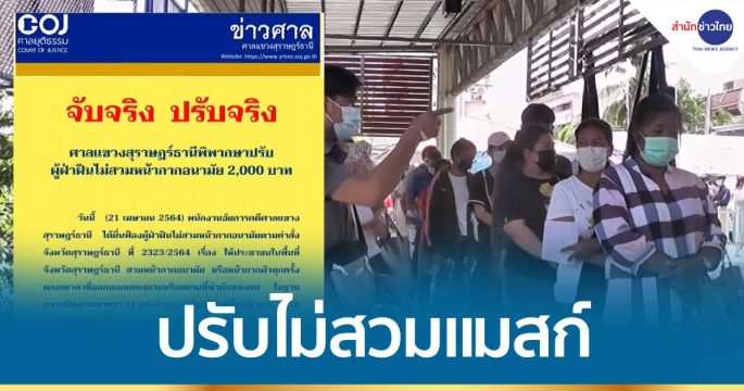 จับจริง ปรับจริงแล้ว! ไม่สวมหน้ากากอนามัย ศาลแขวงสุราษฎร์ธานี พิพากษาปรับ 4,000 บาท จำเลยรับสารภาพลดโทษให้กึ่งหนึ่ง คงปรับ 2,000 บาท