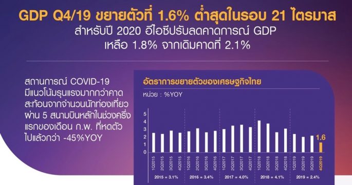 EIC หั่นจีดีพีปีนี้เหลือโต 1.8% จากเดิม 2.1% เนื่องจากไวรัสโควิด-19 กระทบเศรษฐกิจไทยมากกว่าที่คาดไว้
