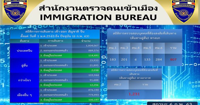 สตม.ตรวจสอบพบคนจีนอยู่ในไทยรวมกว่า1แสนคน ยืนยันมีการตรวจสอบคนเข้าประเทศอย่างเข้มงวด สุ่มตรวจคนจีนในไทย พบมีผู้ต้องสงสัยติดเชื้อ1คน ที่จ.กระบี่ รอยืนยันผลตรวจ