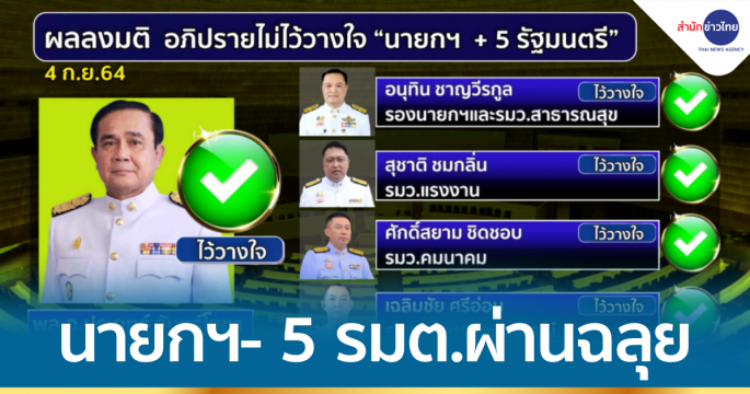 นายเฉลิมชัย ศรีอ่อน รัฐมนตรีว่าการกระทรวงเกษตรและสหกรณ์ ได้คะแนนไว้วางใจมากที่สุด 270 เสียง ด้านนายกฯ ได้คะแนนไว้วางใจ 264 เสียง ส่วน รมว.แรงงาน นายสุชาติ ชมกลิ่น ได้รับความไว้วางใจน้อยที่สุด 263 เสียง