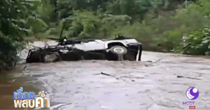 วินาทีชีวิตขณะคนบนรถยนต์สีขาวคันหนึ่งกำลังขับรถข้ามลำห้วยที่น้ำไหลหลากรุนแรงพัดรถจนพลิกคว่ำ โชคดีทั้ง 3 คนในรถหนีเอาชีวิตรอดได้อย่างหวุดหวิด