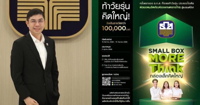 ธ.ก.ส. ท้าประลองนิสิต นักศึกษา ร่วมสร้างสรรค์ไอเดียธุรกิจสุดปัง ผ่านโครงการ BAAC Small Box More Think “กล่องเล็ก คิดใหญ่” ชิงเงินรางวัลมูลค่า 100,000 บาท จับกลุ่มเพื่อน 3 คน เสนอแผนธุรกิจผ่านวิดีโอไม่เกิน 3 นาที