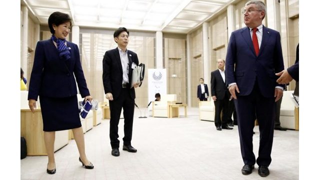 นายโทมัส บาค ประธานคณะกรรมการโอลิมปิกสากล หรือ ไอโอซี และนางยูริโกะ โคอิเกะ ผู้ว่าการกรุงโตเกียว ของญี่ปุ่น