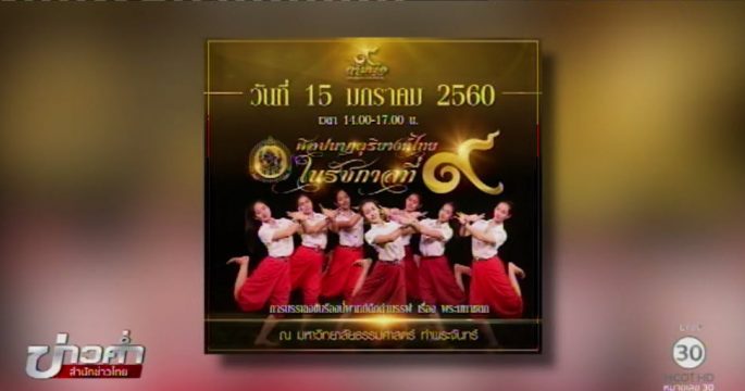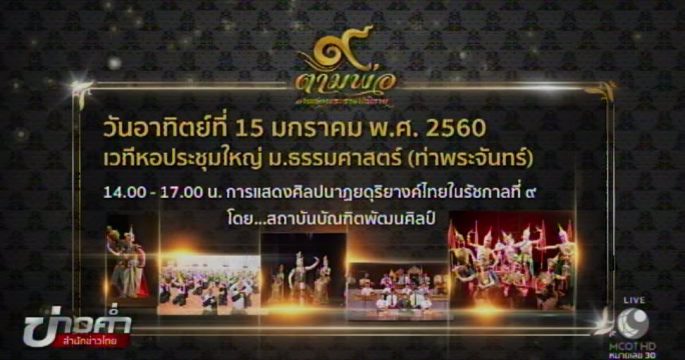 งาน ๙ ตามพ่อ สานต่อพระราชปณิธาน อสมท ร่วมกับสถาบันบัณฑิตพัฒนศิลป์ กระทรวงวัฒนธรรม องค์กรพันธมิตร จัดการแสดงชุดใหญ่ ศิลปนาฏดุริยางค์ไทยในรัชกาลที่ ๙ วันที่ 15 มกราคม 2560