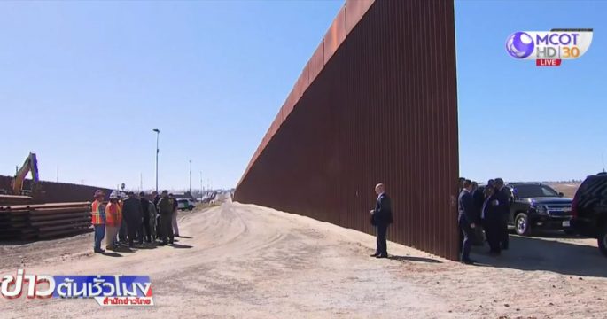 สหรัฐ 19 ก.ย. – ประธานาธิบดีโดนัลด์ ทรัมป์ ของสหรัฐ ปิดฉากการลงพื้นที่ทางตะวันตกของประเทศเป็นเวลา 3 วัน ด้วยการเดินทางไปดูการก่อสร้างกำแพงที่กั้นระหว่างสหรัฐกับเม็กซิโก ในเมืองซาดิเอโก รัฐแคลิฟอร์เนีย ซึ่งเป็น 1 ใน 3 รัฐที่มีพรมแดนติดกับเม็กซิโก สำหรับกำแพงกั้นพรมแดนติดกับเม็กซิโก เป็นแนวคิดของทรัมป์ที่ต้องการสกัดกั้นผู้อพยพเข้าเมืองอย่างผิดกฎหมาย  ข้อมูลล่าสุดของทางการสหรัฐระบุว่า การจับกุมคนลักลอบเข้าเมืองบริเวณพรมแดนติดกับเม็กซิโก ในช่วงเดือนสิงหาคมที่ผ่านมา มีจำนวนลดลงกว่าปกติ นับตั้งแต่มีการก่อสร้างกำแพงกั้นพรมแดนเม็กซิโก. – สำนักข่าวไทย