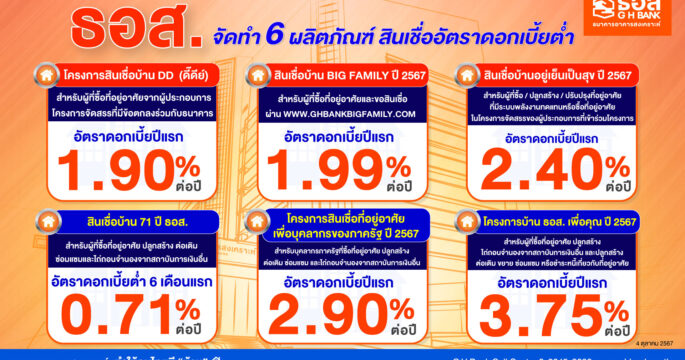 ธอส.ออก 6 สินเชื่อดอกเบี้ยต่ำเพียง 1.90% ต่อปี หนุนคนอยากมีบ้าน กู้ 1 ล้านบาท ผ่อนชำระเงินงวด 3,000 บาท เท่านั้น