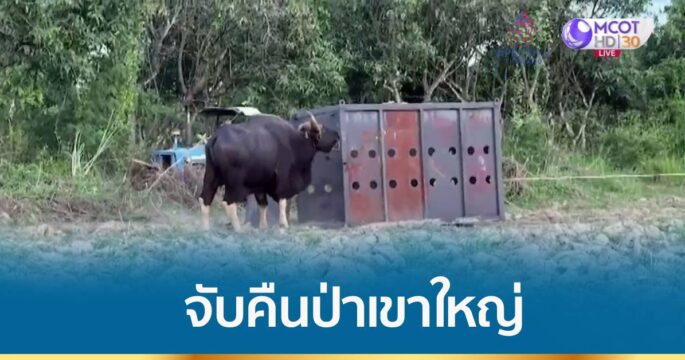 จับกระทิงตาบอดหลงฝูง กลับเข้าป่าเขาใหญ่ หลังหลุดออกมาหากินพืชไร่ของชาวบ้าน เดินข้ามถนนทางหลวงชนบท 3052 สายปากช่อง-วังน้ำเขียว