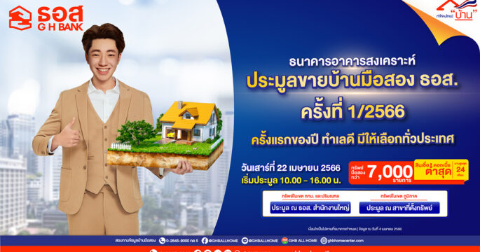 ธอส. ยกทัพบ้านเด่น ทำเลดี ลดราคาสูงสุดถึง 50% มาจำหน่ายกว่า 7,000 รายการ ในงานประมูลขายบ้านมือสอง ธอส. ครั้งที่ 1/2566 วันเสาร์ที่ 22 เมษายน นี้