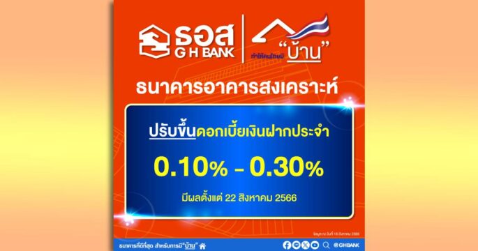 ธอส. ประกาศปรับขึ้นอัตราดอกเบี้ยเงินฝากประจำ สูงสุด 0.30% ต่อปี มีผลตั้งแต่วันที่ 22 สิงหาคม 2566 เป็นต้นไป