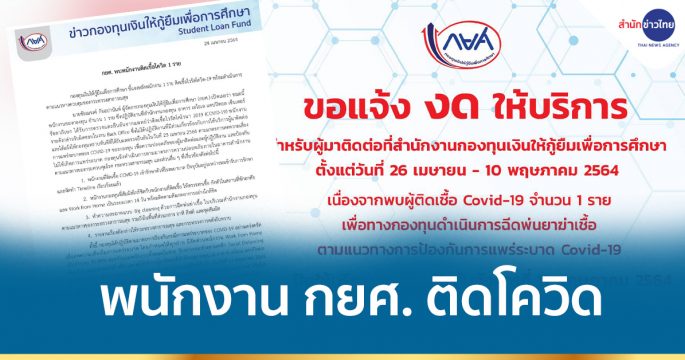 กองทุนเงินให้กู้ยืมเพื่อการศึกษา (กยศ.) ชี้แจงหลังพนักงานติดเชื้อโควิด-19 จำนวน 1 ราย พร้อมดำเนินการตามแนวทางควบคุมโรคของกระทรวงสาธารณสุข