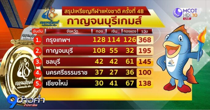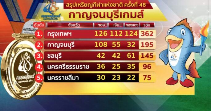 กีฬาแห่งชาติ ครั้งที่ 48 “กาญจนบุรีเกมส์” ปิดฉากลงแล้ว กรุงเทพมหานคร ครองเจ้าเหรียญทองอีกสมัย คว้า 128 เหรียญทอง 114 เหรียญเงิน 126 เหรียญทองแดง ส่วนเจ้าภาพจบอันดับที่ 2