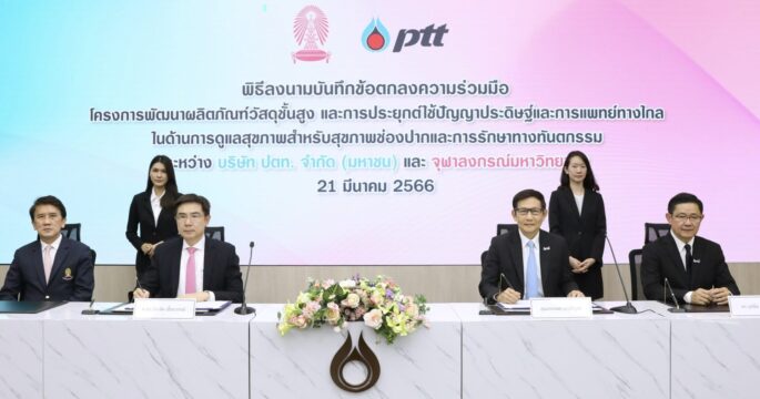 ปตท.จับมือทันตะจุฬาฯ ร่วมพิธีลงนามบันทึกข้อตกลงความร่วมมือระหว่างกันในโครงการพัฒนาผลิตภัณฑ์วัสดุชั้นสูงและการประยุกต์ใช้ปัญญาประดิษฐ์ และการแพทย์ทางไกลในด้านการดูแลสุขภาพสำหรับสุขภาพช่องปากและการรักษาทางทันตกรรม