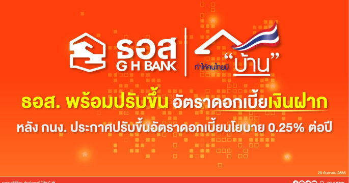 ธอส. ประกาศปรับขึ้นอัตราดอกเบี้ยเงินฝากออมทรัพย์พิเศษ และเงินฝากประจำ 0.05 – 0.35% ต่อปี และอัตราดอกเบี้ยเงินกู้ทุกประเภท 0.25% ต่อปี มีผลตั้งแต่วันที่ 9 มิถุนายน 2566 เป็นต้นไป