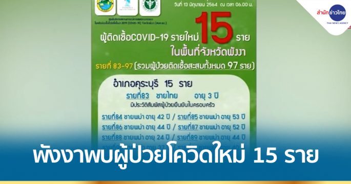 ศูนย์โควิด-19 จังหวัดพังงา รายงานพบผู้ติดเชื้อใหม่ 15 ราย อยู่ในคลัสเตอร์แพปลาคุระบุรี เตรียมจัดตั้งโรงพยาบาลสนามในพื้นที่อาคารโรงเรียน เพื่อรองรับผู้ป่วยซึ่งส่วนใหญ่ไม่แสดงอาการ