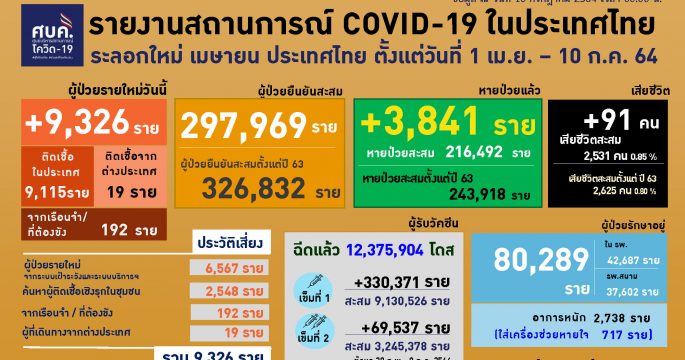 ศบค.เผยตัวเลขโควิด-19 ยอดติดเชื้อนิวไฮ 10,082 ราย เสียชีวิต 141 ราย พบติดเชื้อหลังเสียชีวิตที่บ้าน 2 ราย และเจอคลัสเตอร์ใหม่ 10 แห่ง ใน 8 จังหวัด