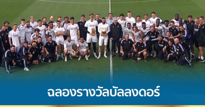 คาริม เบนเซมา และ ธิโบต์ กูร์กตัวส์ ที่คว้าบัลลงดอร์ นำถ้วยรางวัลมาร่วมเฉลิมฉลองและถ่ายรูปกับเพื่อนร่วมสโมสรเรอัล มาดริด และทีมงาน