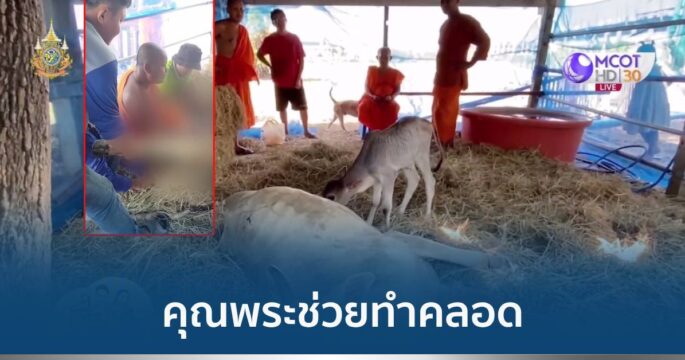 คุณพระช่วยของจริง แม่วัวท้องแก่ลื่นล้ม ลุกยืนเบ่งไม่ได้ พระและฆราวาสช่วยทำคลอดดึงขาหน้าลูกวัวออกมาปลอดภัย