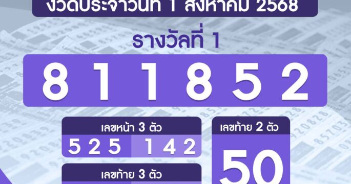 ผลรางวัลสลากกินแบ่งรัฐบาล งวดวันที่ 1 สิงหาคม 2568