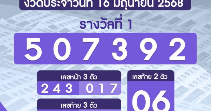 ผลรางวัลสลากกินแบ่งรัฐบาล งวดวันที่ 16 มิถุนายน 2568