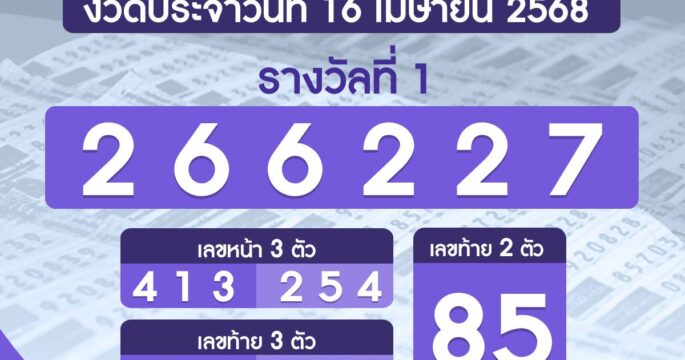 ผลรางวัลสลากกินแบ่งรัฐบาล งวดวันที่ 16 เมษายน 2568 16/04/2568 15:48 FacebookFacebookXTwitterLINELine 139 ผลรางวัลสลากกินแบ่งรัฐบาล งวดวันที่ 16 เมษายน 2568