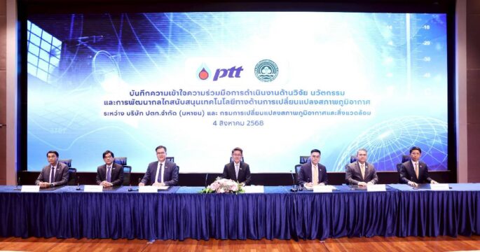 กรุงเทพฯ 4 ส.ค. – บมจ.ปตท. และกรมการเปลี่ยนแปลงสภาพภูมิอากาศและสิ่งแวดล้อม (สส.) ร่วมลงนามบันทึกความเข้าใจความร่วมมือการดำเนินงานด้านวิจัย นวัตกรรม และการพัฒนากลไกสนับสนุนเทคโนโลยี ทางด้านการเปลี่ยนแปลงสภาพภูมิอากาศ หนุนเป้าหมาย Net Zero ของประเทศไทย ปตท. แจ้งว่า ความร่วมมือครั้งนี้จะมุ่งเน้นการแลกเปลี่ยน และเสริมสร้างความร่วมมือด้านข้อมูล องค์ความรู้ งานวิจัยและนวัตกรรม รวมถึงการพัฒนากลไกสนับสนุนเทคโนโลยีทางด้านการเปลี่ยนแปลงสภาพภูมิอากาศ อาทิ การพัฒนาโครงการการดักจับและกักเก็บคาร์บอนไดออกไซด์ การพัฒนาโครงการเทคโนโลยีไฮโดรเจน และอนุพันธ์ของไฮโดรเจน ตลอดจนเทคโนโลยีอื่นๆ ที่เกี่ยวข้อง เพื่อร่วมผลักดันการลดการปล่อยก๊าซเรือนกระจกของประเทศไทย ให้บรรลุเป้าหมายการปล่อยก๊าซเรือนกระจกสุทธิเป็นศูนย์ (Net Zero Emissions) และขับเคลื่อนประเทศสู่ความยั่งยืนในระดับสากล. -511- สำนักข่าวไทย