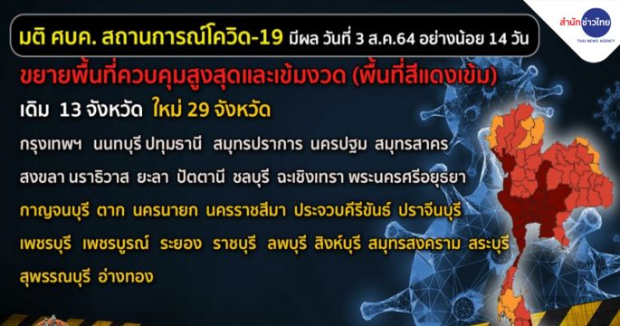 ราชกิจจานุเบกษา ประกาศปรับ 29 จังหวัดพื้นที่สีแดงเข้ม โดยให้ปฏิบัติตามมาตรการต่อเนื่องถึง 31 ส.ค.64 ประเมินสถานการณ์ทุก 14 วัน เริ่มตั้งแต่ 3 ส.ค.นี้