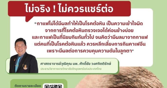 ตามที่มีการแชร์ข้อความว่าหากกินกาแฟ จะทำให้ความดันในลูกตาสูง และเป็นต้อหินนั้น บทสรุป : ไม่จริง ไม่ควรแชร์ ❌ ศูนย์ชัวร์ก่อนแชร์ ตรวจสอบกับ ศาสตราจารย์วุฒิคุณ นพ. ศักดิ์ชัย วงศกิตติรักษ์ ประธานวิชาการราชวิทยาลัยจักษุแพทย์แห่งประเทศไทย “กาแฟไม่ได้มีผลทำให้เป็นโรคต้อหิน เป็นความเข้าใจผิดจากการที่โรคต้อหินตรวจเจอได้ค่อนข้างบ่อย และกาแฟเป็นที่นิยมกินกันทั่วไป จนคิดว่ามีผลมาจากกาแฟแต่คนที่เป็นโรคต้อหินแล้ว ควรหลีกเลี่ยงการกินกาเฟอีน เพราะมีผลต่อการควบคุมความดันในลูกตา”