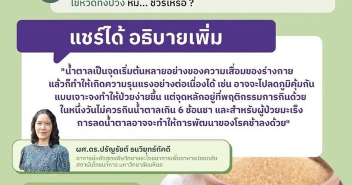 จากกรณีมีการแชร์ข้อความเตือนว่าน้ำตาลเป็นพิษอย่างเลวร้ายสำหรับมนุษย์ เป็นความหิวโหยของเซลล์มะเร็งและเป็นสาเหตุของไข้หวัดทั้งปวงนั้น บทสรุป : แชร์ได้ อธิบายเพิ่ม ⚠️ ศูนย์ชัวร์ก่อนแชร์ตรวจสอบกับ ผศ.ดร.ปรัญรัชต์ ธนวิยุทธ์ภัคดี อาจารย์หลักสูตรพิษวิทยาและโภชนาการเพื่ออาหารปลอดภัย สถาบันโภชนาการ มหาวิทยาลัยมหิดล “น้ำตาลเป็นจุดเริ่มต้นหลายอย่างของความเสื่อมของร่างกาย แล้วก็ทำให้เกิดความรุนแรงอย่างต่อเนื่องได้อาจจะไปลดภูมิคุ้มกันแบบเจาะจงที่ทำให้ป่วยง่ายขึ้น ในหนึ่งวันไม่ควรกินน้ำตาลเกิน 6 ช้อนชา” สัมภาษณ์เมื่อ 18 มกราคม 2565 ตรวจสอบข้อเท็จจริง โดย พีรพล อนุตรโสตถิ์เรียบเรียงโดย : ชยานิษฐ์ ผ่องใส
