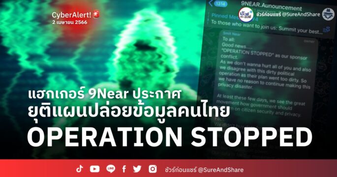 ชัวร์ก่อนแชร์ CyberAlert!🚨 โดย พีรพล อนุตรโสตถิ์ กรุงเทพฯ 2 เม.ย. 66 – เมื่อเวลา 12.23 น. วันที่ 2 เมษายน 2566 ตัวแทนแฮกเกอร์ 9Near ประกาศผ่านข้อความซึ่งส่งในกลุ่มสนทนาของแอป Telegram ชื่อ 9Near.Aunouncement ซึ่งมีสมาชิกติดตามกว่า 2,200 ราย และเป็นกลุ่มที่ไม่อนุญาตให้มีการส่งข้อความใด ๆ ผู้ใช้งานชื่อ Smit Near ซึ่งเป็นเจ้าของกลุ่ม ได้ส่งข้อความเข้าในกลุ่มดังกล่าว โดยมีเนื้อหาสำคัญ ประกาศข่าวดีว่า “OPERATION STOPPED” as our sponsor conflict. ซึ่งหมายถึงว่า การปฏิบัติการได้หยุดลงแล้ว เนื่องจากความขัดแย้งไม่ลงรอยกับ “สปอนเซอร์” ของเรา เนื้อความซึ่งเป็นภาษาอังกฤษ ยังกล่าวถึงคนทั่วไปว่า พวกตนไม่ต้องการทำร้ายคุณทุกคน และเราไม่เห็นด้วยกับการปฏิบัติการทางการเมืองตามแผนการที่พวกเขาวางไว้ ซึ่งมันกำลังสกปรกยิ่งขึ้นเรื่อย ๆ ดังนั้น เราจึงไม่มีเหตุผลใด ๆ […]