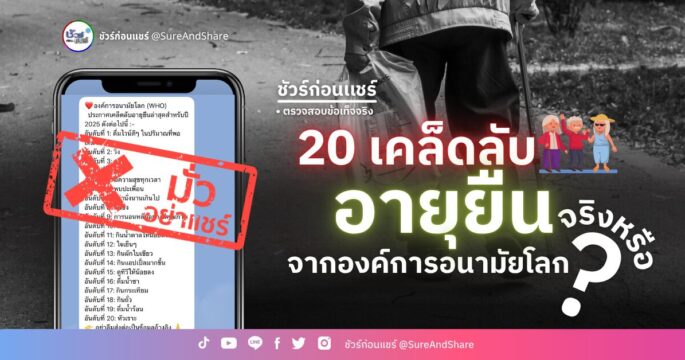 บทสรุป ไม่จริง ❌ ไม่ควรแชร์ต่อ ศูนย์ชัวร์ก่อนแชร์ ตรวจสอบพบว่า บทความ 20 เคล็ดลับอายุยืนที่อ้างว่ามาจากองค์การอนามัยโลก​ (WHO)​ แปลมาจากบทความภาษาจีนที่เผยแพร่ในปี 2562 ถูกนำมาแปลและแชร์ต่อเป็นภาษาไทยในปีเดียวกัน โดยมีการเปลี่ยนเนื้อหาเคล็ดลับข้อที่ 1 ถึง 3 ครั้ง ในปี 2562 2563 และ 2568 จาก การร้องเพลง เป็น การกินเนื้อสัตว์ให้มากขึ้น และสุดท้ายเป็น การดื่มไวน์ดี ๆ ในปริมาณที่พอเหมาะ จากการตรวจสอบบนเว็บไซต์ทางการขององค์การอนามัยโลก (WHO) โดยใช้คำสำคัญ อย่าง WHO Tips, longevity, long life, Hug, Run, Happy ไม่พบข้อมูลที่ตรงกับเคล็ดลับอายุยืนที่แชร์กันแต่อย่างใด อย่างไรก็ตาม ศูนย์ชัวร์ก่อนแชร์ พบบทความของ WHO เกี่ยวกับ 10 เคล็ดลับสุขภาพที่จะช่วยให้คุณมีสุขภาพที่ดีขึ้นในปี 2025 โดยมีเนื้อหาสำคัญ ได้แก่ 30 มิถุนายน […]