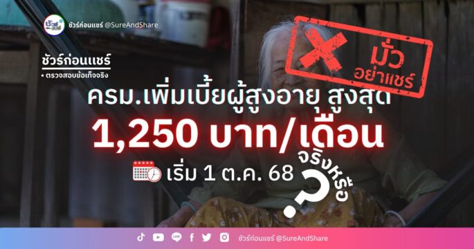 ตามที่มีการแชร์ข้อความ ครม. เพิ่มเบี้ยผู้สูงอายุ สูงสุด 1,250 บาท/เดือน เริ่ม 1 ต.ค. 68 นั้น  📌 บทสรุป : ❌  ไม่จริง ไม่ควรแชร์ต่อ ❌ ปัจจุบันรัฐบาลยังจ่ายเบี้ยผู้สูงอายุเท่าเดิม คือ– อายุ 60-69 ปี จะได้รับเบี้ยยังชีพ อัตรา 600 บาทเดือน– อายุ 70-79 ปี จะได้รับเบี้ยยังชีพ อัตรา 700 บาท/เดือน– อายุ 80-89 ปี จะได้รับเบี้ยยังชีพ อัตรา 800 บาท/เดือน– อายุ 90 ปี ขึ้นไป จะได้รับเบี้ยยังชีพ อัตรา 1,000 บาท/เดือน ศูนย์ชัวร์ก่อนแชร์ ตรวจสอบพบว่า กรมกิจการผู้สูงอายุ กระทรวงการพัฒนาสังคมและความมั่นคงของมนุษย์ ยืนยัน ผ่านเพจเฟซบุ๊กว่า […]