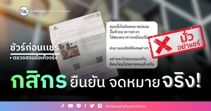 6 สิงหาคม 2566 ตามที่มีการแชร์ จดหมายปลอมอ้างธนาคาร หลอกสแกนรับสิทธิพิเศษ นั้น 📌 บทสรุป : ❌  ไม่จริง ไม่ควรแชร์ต่อ ❌ จดหมายจริงของธนาคารกสิกรไทย ศูนย์ชัวร์ก่อนแชร์ ตรวจสอบพบว่า ธนาคารกสิกรไทย ยืนยันผ่านเพจเฟซบุ๊ก “KBank Live” ว่า จดหมายดังกล่าว เป็นของจริง โดยเป็นจดหมายเพื่อแจ้งสิทธิพิเศษของขวัญThe Wisdom Delight Gift ปี 2566 ลงวันที่ 24 ก.ค. 2566 ที่จัดส่งแบบลงทะเบียนให้ลูกค้าผู้ถือบัตรเดอะวิสดอมกสิกรไทยที่ได้รับสิทธิ์ ไม่ใช่มิจฉาชีพแต่อย่างใด อย่างไรก็ตาม ฐานข้อมูลศูนย์ชัวร์ก่อนแชร์ พบว่า ก่อนหน้านี้เคยมีจดหมายจริงจากหลายองค์กรถูกทำให้เข้าใจผิดว่าเป็นมิจฉาชีพ ทั้ง สำนักงานป้องกันและปราบปรามการฟอกเงิน (ปปง.) ไปรษณีย์ไทย ใบสั่งจราจร แบบสำรวจของศาลปกครอง ดังนั้นควรตรวจสอบความถูกต้องจากหน่วยงานต้นทางก่อนทุกครั้ง ก่อนส่งต่อข้อมูล 6 สิงหาคม 2566ศูนย์ชัวร์ก่อนแชร์สำนักข่าวไทย อสมทตรวจสอบข้อเท็จจริงโดย เสาวภาคย์ รัตนพงศ์บันทึกการแก้ไข : […]
