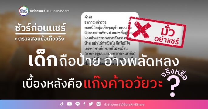 ชัวร์ก่อนแชร์ : ระวังเด็กถือป้ายที่อยู่อ้างพลัดหลง เบื้องหลังคือแก๊งค้าอวัยวะ จริงหรือ ?