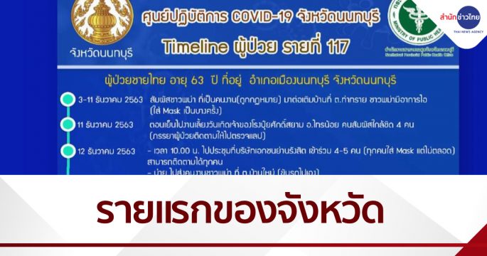 จ.นนทบุรี พบชายอายุ 64 ปี ป่วยโควิด-19 เป็นรายแรกของจังหวัดในการระบาดระลอกใหม่ สอบสวนโรคพบสัมผัสคนงานเมียนมาที่มาต่อเติมบ้านช่วงวันที่ 3-11 ธ.ค. และพบเดินทางไปในหลายพื้นที่ทั้งใน กทม. และนนทบุรี