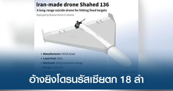 กองทัพอากาศยูเครนเปิดเผยวันนี้ว่า รัสเซียส่งอากาศยานไร้คนขับหรือโดรนพิฆาตมากถึง 24 ลำ เข้ามาปฎิบัติการในยูเครนเมื่อคืนที่ผ่านมา ซึ่งถูกยูเครนยิงตกไป 18 ลำ ก่อนหน้านี้รัสเซียเพิ่งกล่าวหายูเครนว่าพยายามใช้โดรนโจมตีเพื่อลอบสังหารผู้นำรัสเซีย