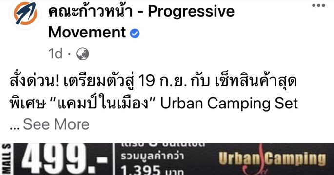 เพจคณะก้าวหน้า”ประกาศขายเซ็ทอุปกรณ์ลุยม็อบ “แคมป์ในเมือง” ด้าน พรรณิการ์ เผย จะร่วมชุมนุม 19 ก.ย. ด้วย