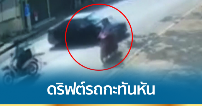 ภาพจากกล้องวงจรปิดจากร้าน “อ้วนอะไหล่ยนต์” โพสต์ผ่านเฟซบุ๊กเผยให้เห็นภาพรถเก๋ง สีดำ คันหนึ่งขับมาด้วยความเร็ว เหมือนดริฟต์รถกลับลำกลางถนน ทำให้รถจักรยานยนต์ 2 คัน เกือบจะโดนชนอย่างหวุดหวิด