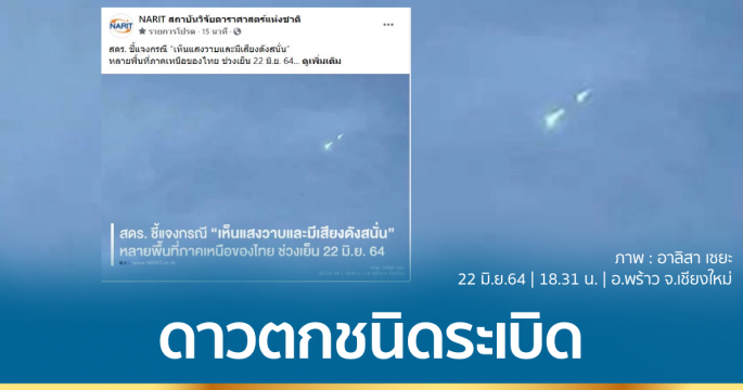 4 ส.ค. – สมาคมดาราศาสตร์ไทยแจงปรากฏการณ์ “ดาวตกลูกไฟ” โผล่บนท้องฟ้าหลายจังหวัดของประเทศไทย เมื่อคืนที่ผ่านมา เวลา 00.00 น. (วันที่ 4 ส.ค.) สมาคมดาราศาสตร์ไทยได้แจ้งว่า เกิดลูกไฟขนาดใหญ่พร้อมกับเสียงระเบิดดังขึ้นปรากฏบนท้องฟ้าเหนือหลายจังหวัดของประเทศไทย เมื่อสักครู่ที่ผ่านมา จากตรวจสอบน่าจะเป็น ดาวตกชนิดลูกไฟ (meteoroid) โดยลักษณะที่ปรากฏเป็นแสงสีเขียว อาจบ่งบอกถึงองค์ประกอบของธาตุนิกเกิล โดยทั่วไปแล้ว ดาวตก (Meteor) เกิดขึ้นเมื่อวัตถุท้องฟ้าขนาดเล็กเคลื่อนที่เข้าสู่ชั้นบรรยากาศโลกและเสียดสีกับอากาศที่ระดับความสูงประมาณ 80-120 กิโลเมตร ทำให้เกิดแสงสว่างวาบพาดผ่านท้องฟ้า ยิ่งวัตถุมีขนาดใหญ่เท่าใด ปริมาณความร้อนและแสงสว่างที่เกิดขึ้นก็จะยิ่งมากตามไปด้วย จากภาพและคลิปวิดีโอที่เผยแพร่ออกมา ดาวตกในครั้งนี้มีขนาดใหญ่และมีความสว่างมากเป็นพิเศษ ความสว่างของมันใกล้เคียงกับดาวศุกร์ ทำให้ถูกจัดเป็นดาวตกชนิด #ลูกไฟ (Fireball) อย่างชัดเจน ส่วนการปรากฏของแสงสีเขียว สามารถตีความได้ว่าดาวตกนี้มีส่วนประกอบของธาตุโลหะอย่างนิกเกิล.-สำนักข่าวไทย