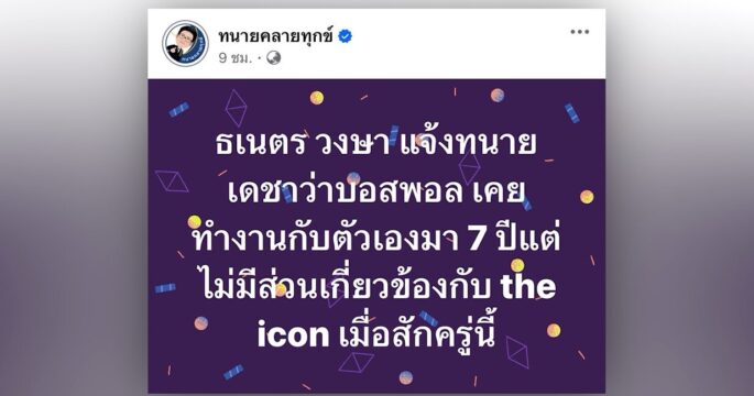 “ธเนตร วงษา” แจงผ่านทนายเดชา ยันไม่มีเอี่ยว “ดิไอคอนกรุ๊ป” แม้เคยทำงานกับตนมา 7 ปี