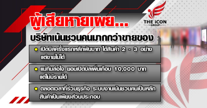 ผู้เสียหายชาวขอนแก่น แฉ “ดิไอคอน” เน้นชวนคน ไม่เน้นขายสินค้า ขณะที่ช่องทางออนไลน์ในพื้นที่ขอนแก่น ยังเดินหน้าชักชวนคนต่อ โดยใช้โปรโมชั่นท่องเที่ยวล่อใจ