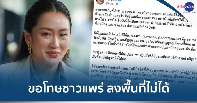 “แพทองธาร” ขอโทษชาวแพร่ลงพื้นที่ไม่ได้ สาเหตุจากสภาพอากาศทำให้ไม่สามารถเดินทางได้ โดยไปที่ จ.น่าน จังหวัดเดียว พร้อมส่งกำลังใจไปภูเก็ต