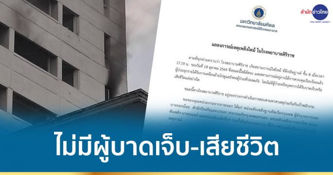 รพ.ศิริราช แจงเหตุไฟไหม้ชั้น 8 ตึกอัษฎางค์ ไม่มีผู้บาดเจ็บ-เสียชีวิต ย้ายผู้ป่วยออกจากตึกปลอดภัย อยู่ระหว่างสอบสวนหาสาเหตุ พร้อมขอบคุณเจ้าหน้าที่ทุกหน่วยงานที่ให้การช่วยเหลือ