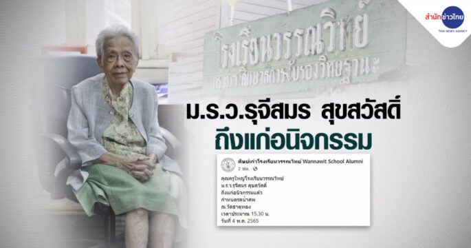 ม.ร.ว.รุจีสมร สุขสวัสดิ์ อดีตครูใหญ่โรงเรียนวรรณวิทย์ ถึงแก่อนิจกรรมแล้ว โดยมีกำหนดรดน้ำศพ ณ วัดธาตุทอง เวลาประมาณ 15.30 น. วันที่ 4 พ.ค.65