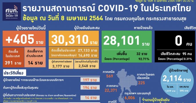 ศบค.เผยวันนี้มีผู้ติดเชื้อ 1,767 ราย เสียชีวิต 2 ราย เป็นพระสงฆ์และหญิงวัย 70 ปี พบ 6 จังหวัดยอดผู้ป่วยสะสมพุ่งเกิน 500 คน วอนปฏิบัติตามมาตรการป้องกันโรค และขอความร่วมมือทุกหน่วยงานให้พนักงานที่เดินทางไปต่างจังหวัดช่วงเทศกาลสงกรานต์ WFH