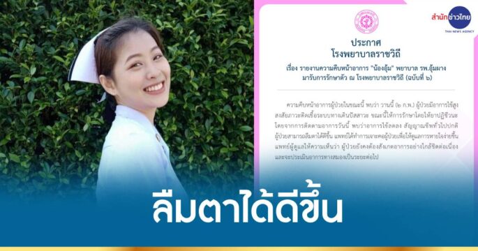 รพ.ราชวิถี เผย “น้องอุ้ม” พยาบาล รพ.อุ้มผาง อาการคงที่ ทำตามคำสั่งได้บางครั้ง รู้สึกตัวดี ลืมตาเองได้ดีขึ้น นักกายภาพบำบัดดูแลต่อเนื่อง โดยขณะนี้ฝึกเดินให้ผู้ป่วย เพื่อช่วยฟื้นฟูกำลังกล้ามเนื้อขาแล้ว